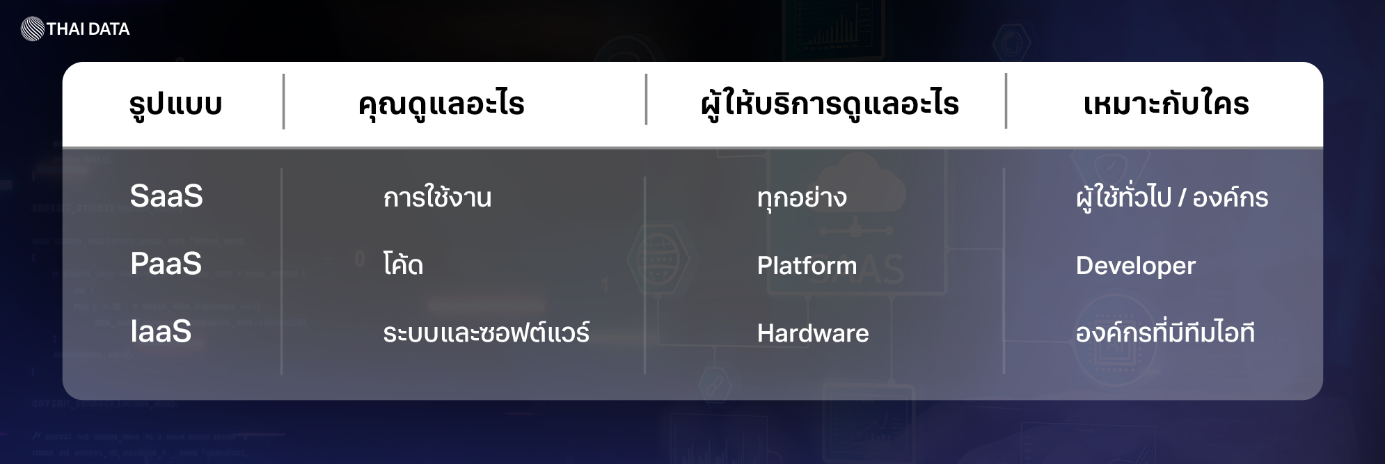 คุณไม่ต้องมี Data Center ของตัวเอง ผู้ให้บริการจะใช้ IaaS หรือ PaaS เป็นพื้นฐานเพื่อรันระบบ Software as a Service ให้ทำงานเสถียร - ผู้ใช้เข้าถึงได้ผ่านเบราว์เซอร์หรือแอปพลิเคชัน